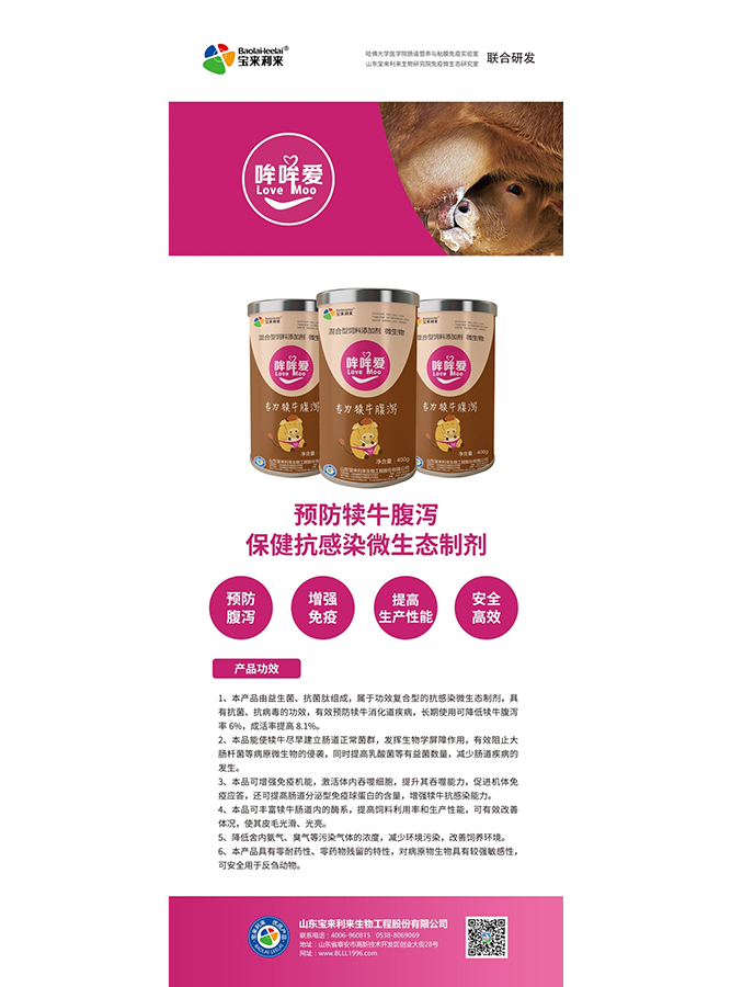 寶來利來科技集團的反芻板塊由碧藍反芻事業部、反芻事業部和U蛋白事業部組成。反芻事業部成立于 2006 年,專注于反芻動物(如奶牛、肉牛、肉羊等)的微生態技術研發、產品生產及解決方案服務,旨在推動生態養殖與綠色畜牧業發展,依托公司動物微生態技術,為反芻動物提供健康管理、疾病防控、營養優化及環境改善等綜合解決方案。2017 年集團成立碧藍反芻事業部,主要從事反芻動物微生態制劑和飼料等產品的銷售與服務,專注于反芻動物(如牛、羊)的生態養殖和健康管理。推出了一系列產品,如群壯系列、霉清、保青寶等反芻動物專用微生態制劑,近期還推出了第三代脲酶納米抑制劑產品 U 蛋白等產品,助力畜牧業可持續發展。